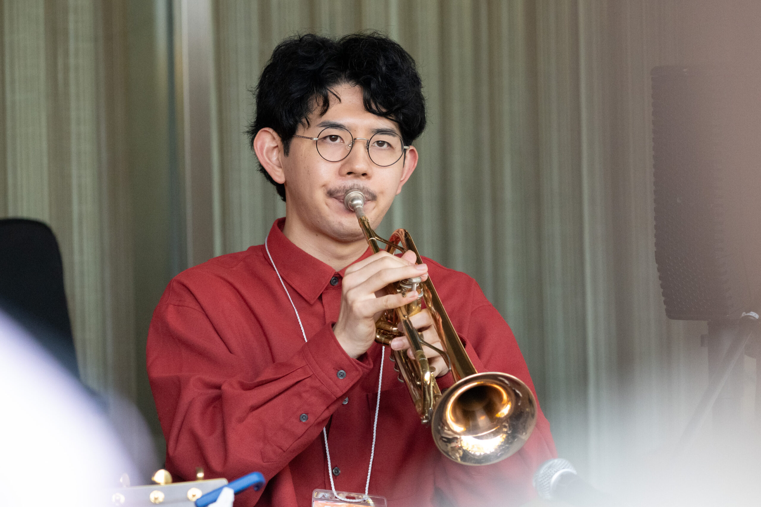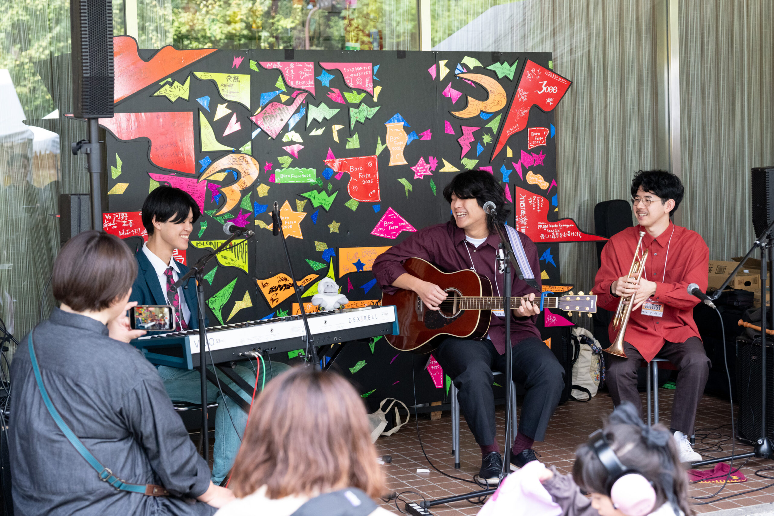 平野駿(Re&Tp)と舩越悠生(Me&Key)が楽器をリコーダーと鍵盤ハーモニカに持ち替え、彼ららしい自然体で楽しげな音楽が青空に響いていく。