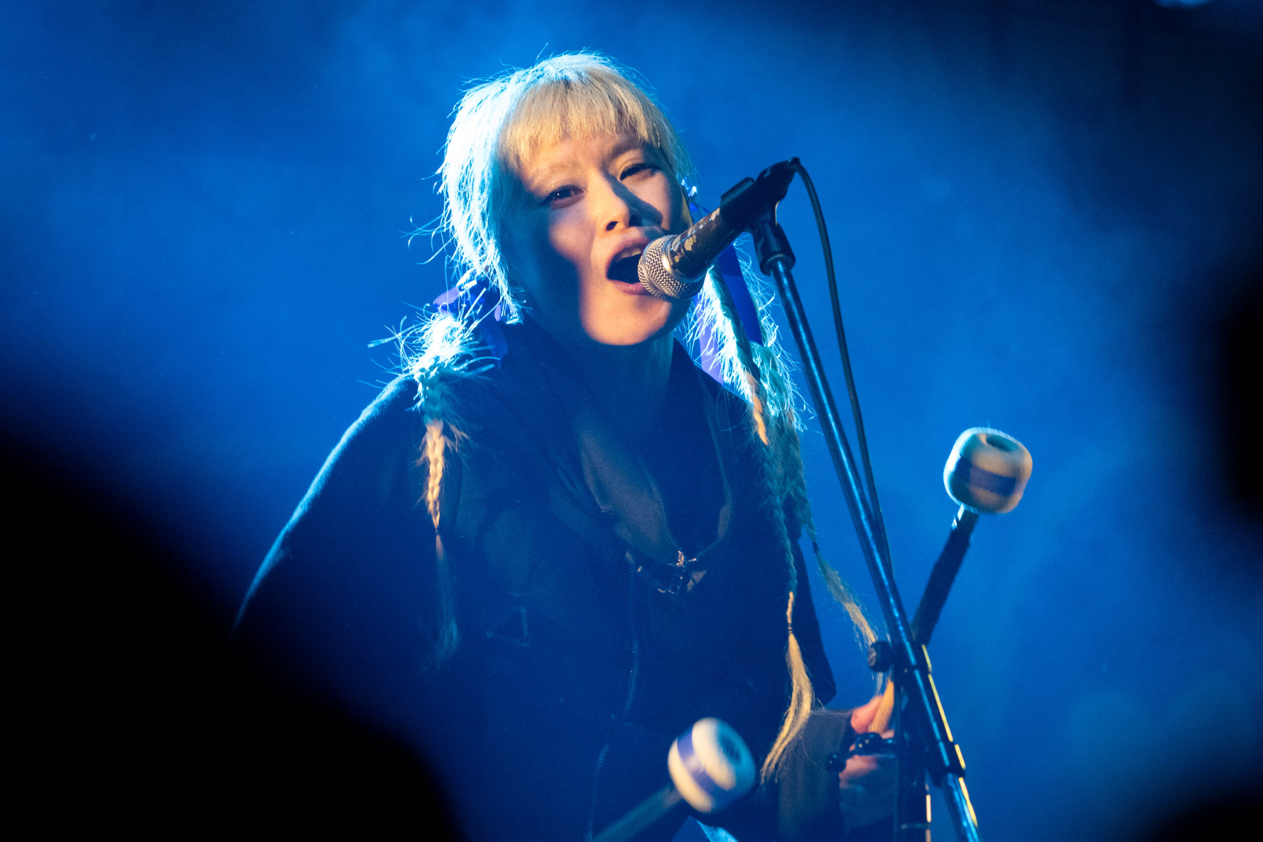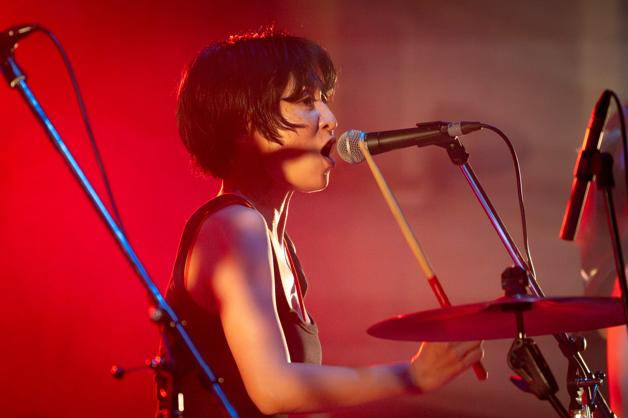 RED ARIKO(drums, sampler, vocals)とBLUE YUKARI(floorTom, vocals)によるツイン・ドラムが、4人のシャウトと共鳴しながら巨大な鼓動となり、会場全体を揺さぶった。