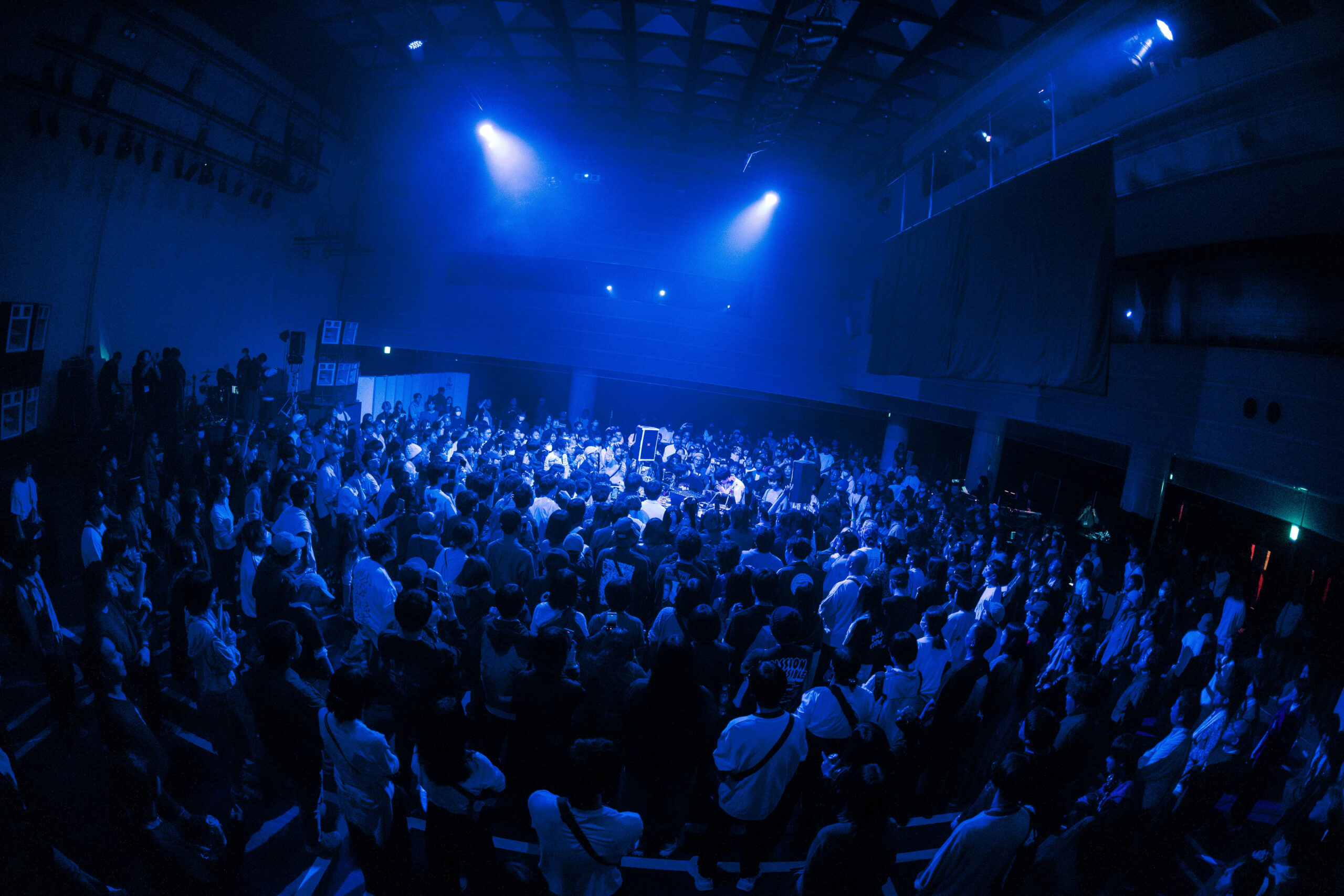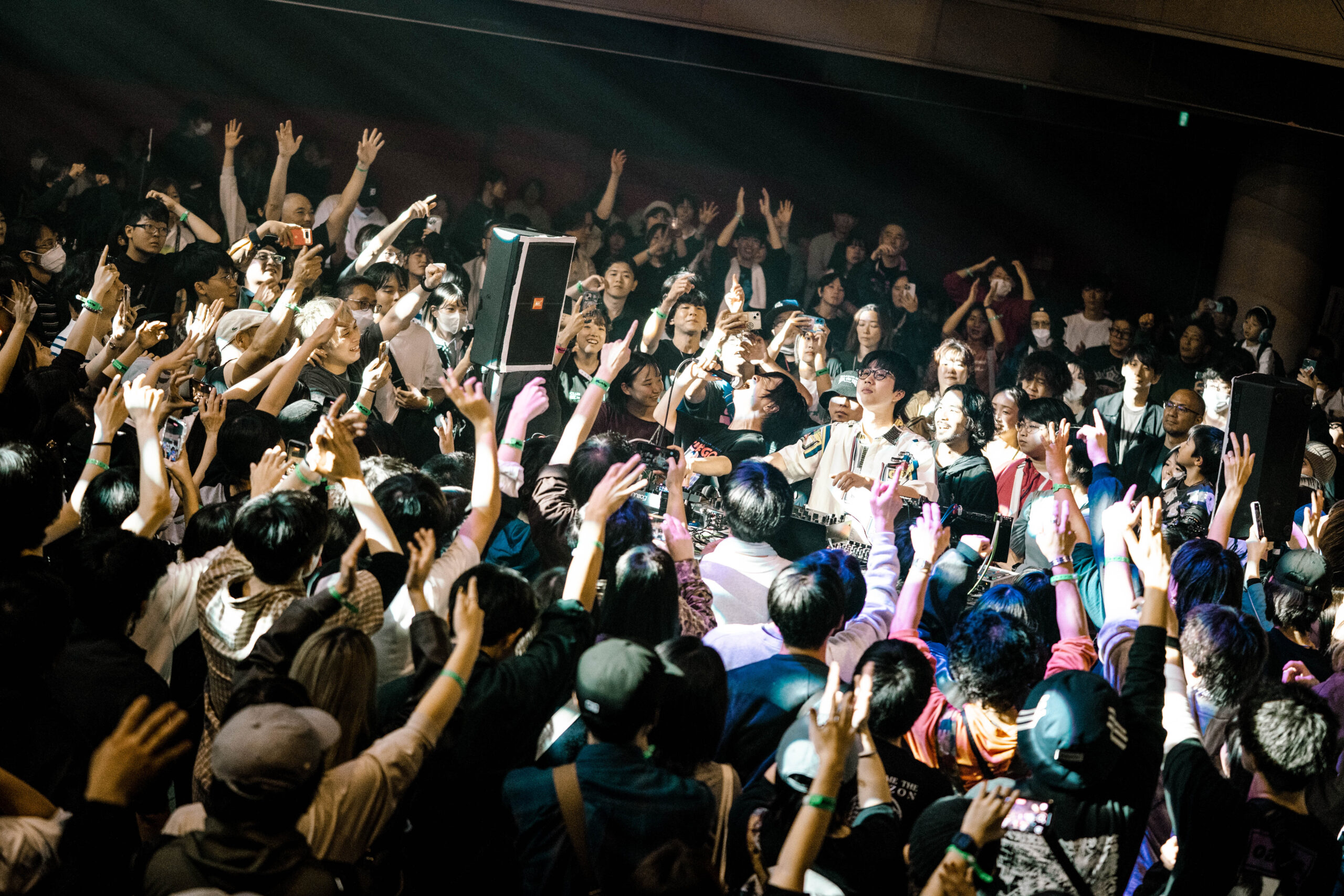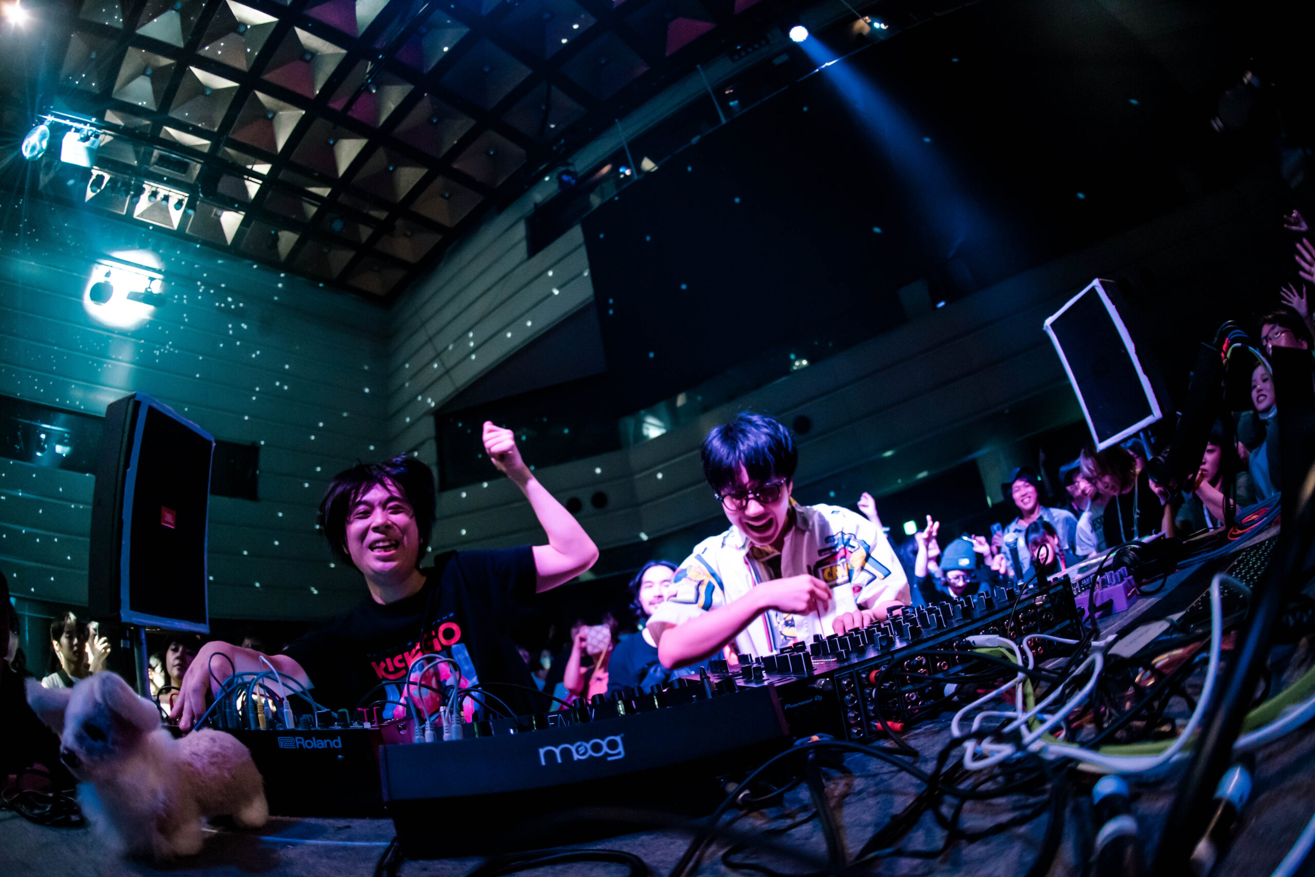 KBSホールはクラブの様相を呈し、ダンスフロアに一変。ファニーな電子音が揺れながら深く響くベースに乗って、まるでハイウェイを走り抜けるような感覚になる。柴田が犬のぬいぐるみを掲げると、観客の手が頭上に差し出され、応答する。フロアに炸裂するのは、彼らから放たれる音のみだ。