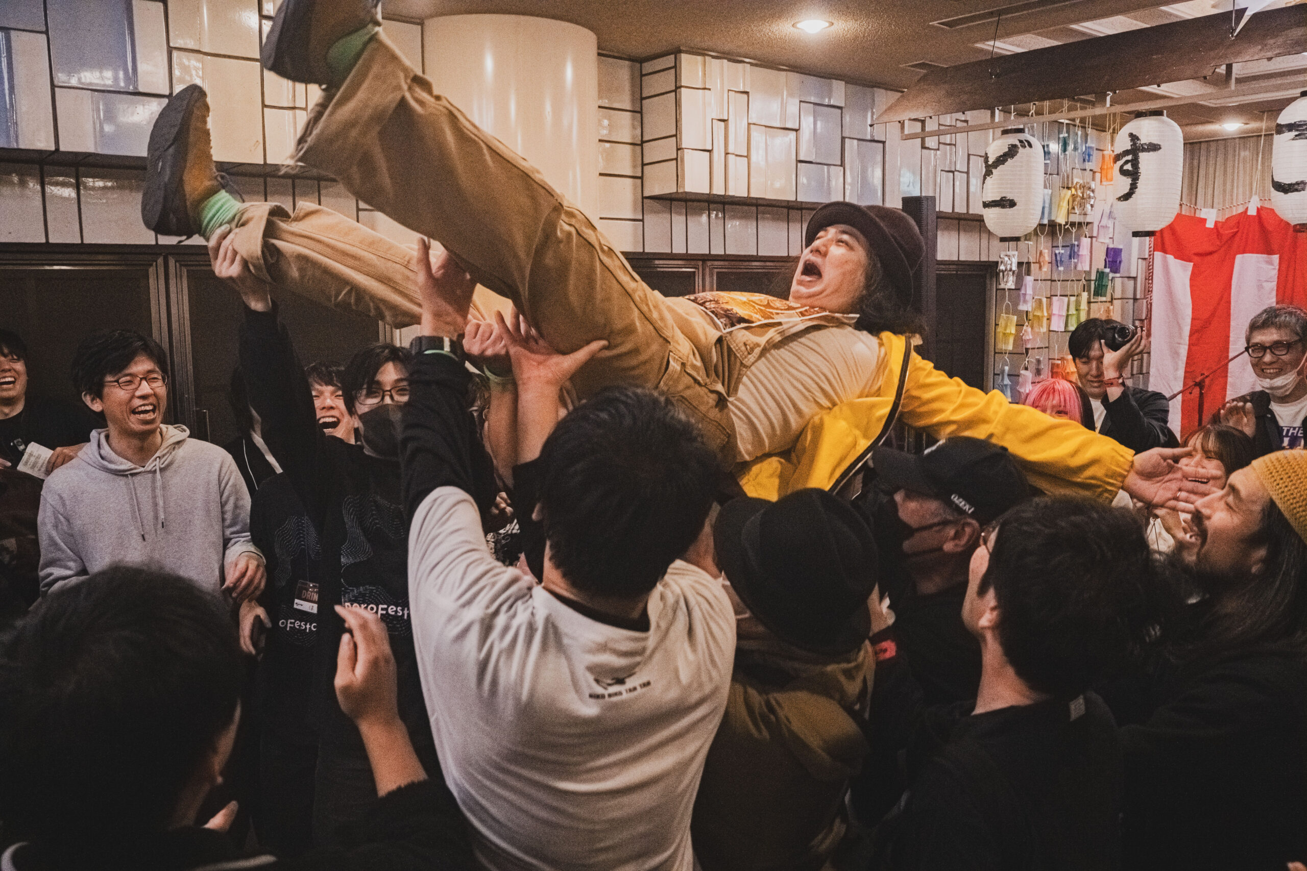 「青い春」はボロフェスタ2025特別ver。ギターを置き、黄色いジャケットのジップを開けると、そこには“インナーステンドグラス”が。光に照らされた瞬間、観客の笑顔がいっせいに弾けた。最後は「贈る言葉」。年齢も立場も関係なく、ここにいる全員が“ボギ八先生”の教え子になる。観客に胴上げされ、屋外まで運ばれていくボギー。その姿は、この瞬間に全力で生きる音楽の力そのものだった。