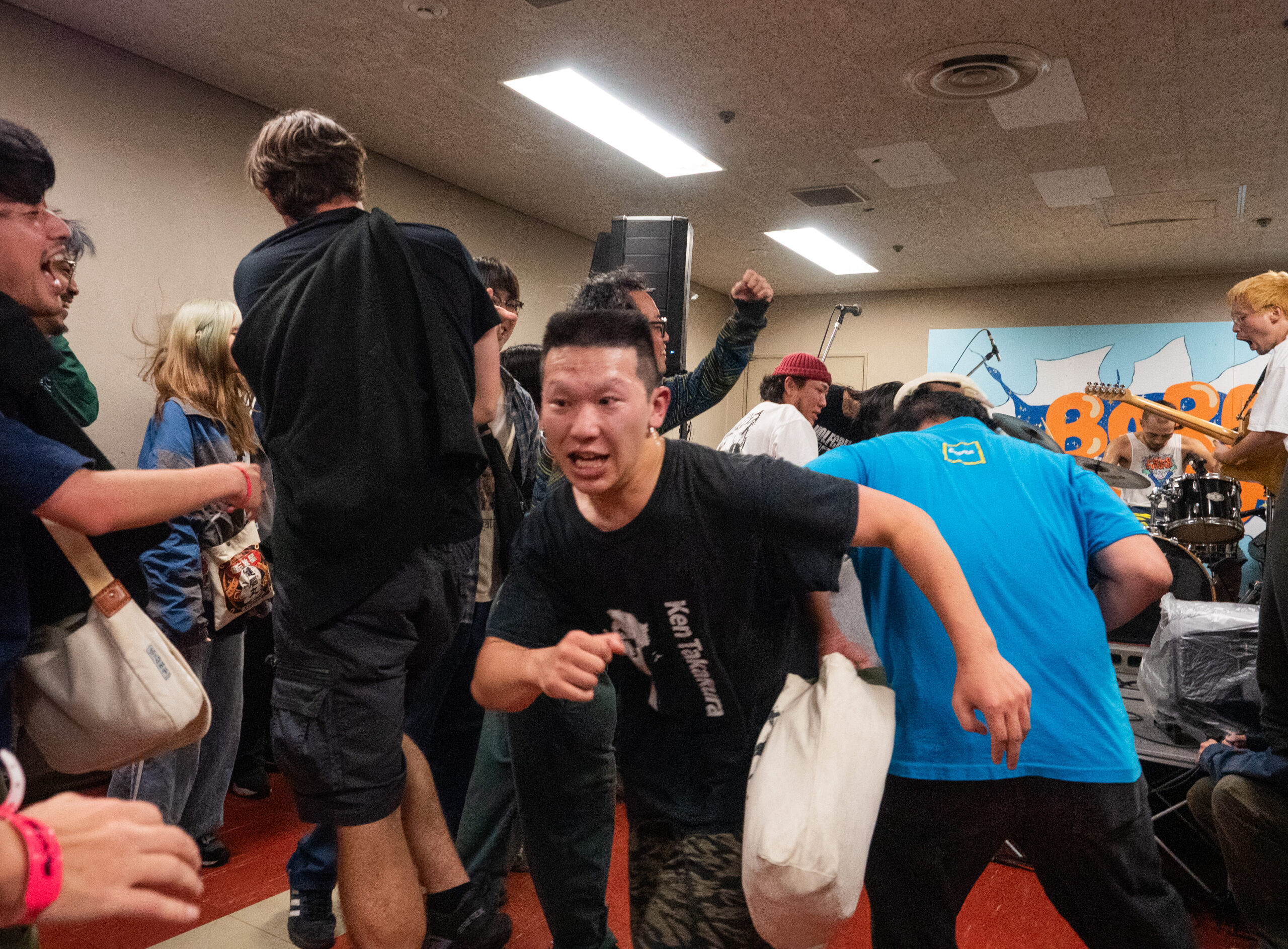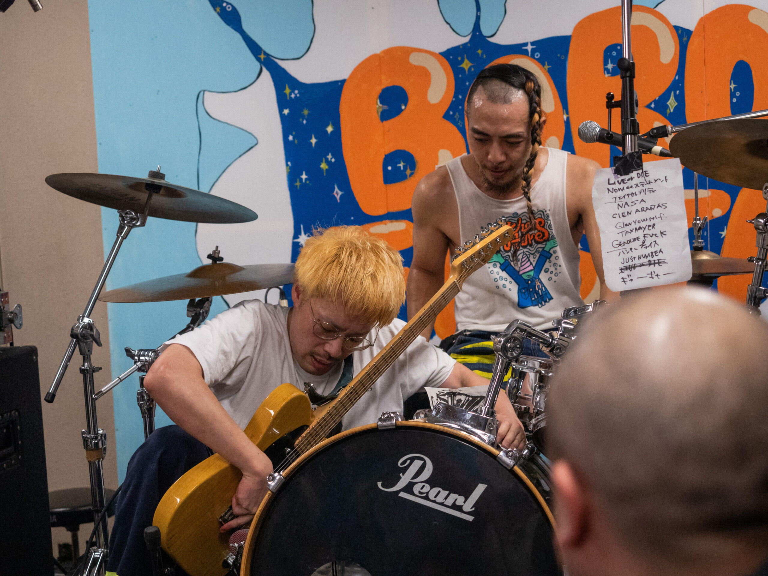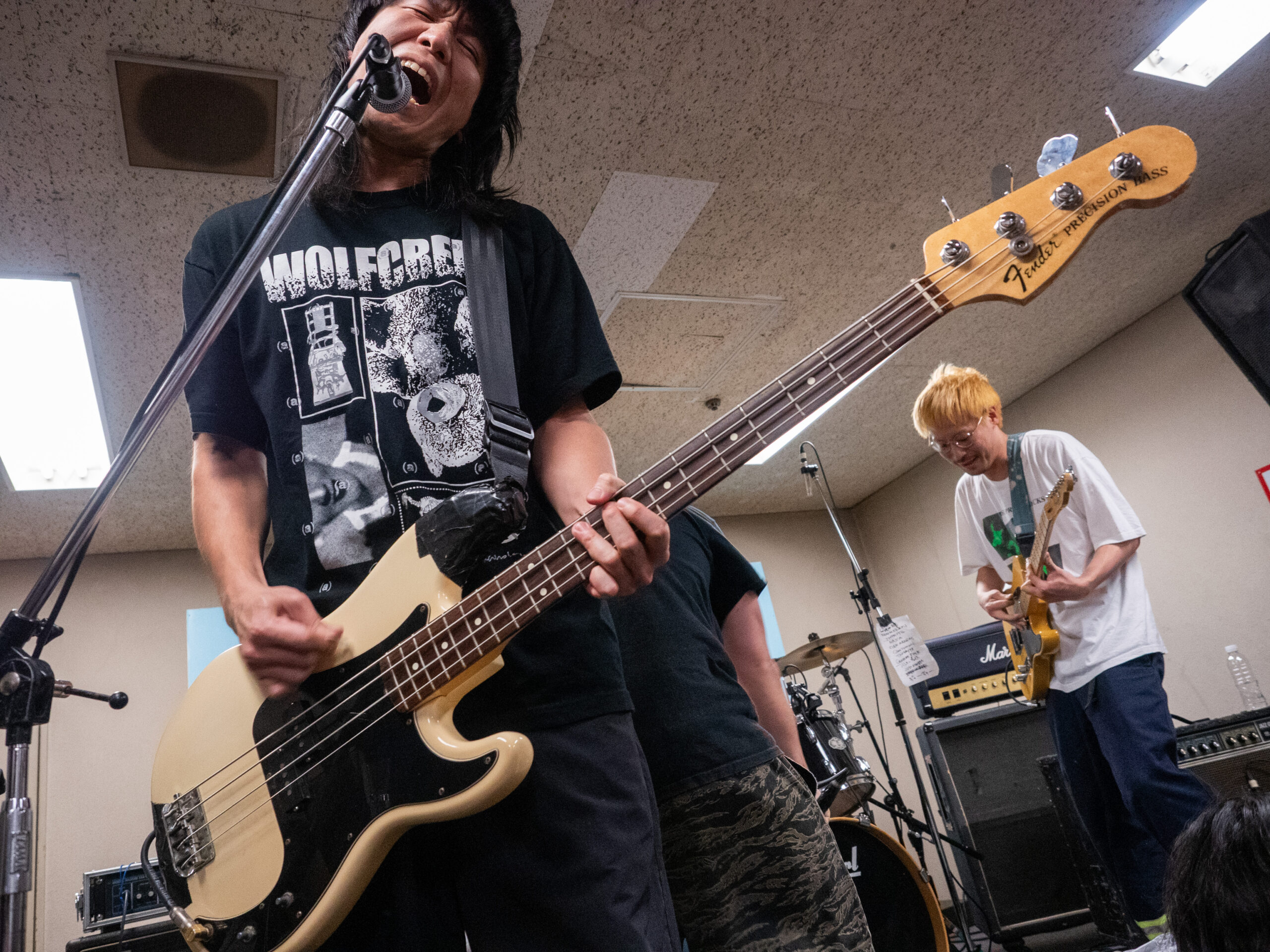 無造作に楽器が置かれた街の底STAGE。大トリを飾ったのは高倉健。ショートコアのように20分ほどで10数曲を駆け抜けた。全員が眉間にシワを寄せながら演奏し、苦しんでいるのか怒っているのか見分けがつかない。ただ行き場のないエネルギーが、止まることなく噴き上がり続けていた。