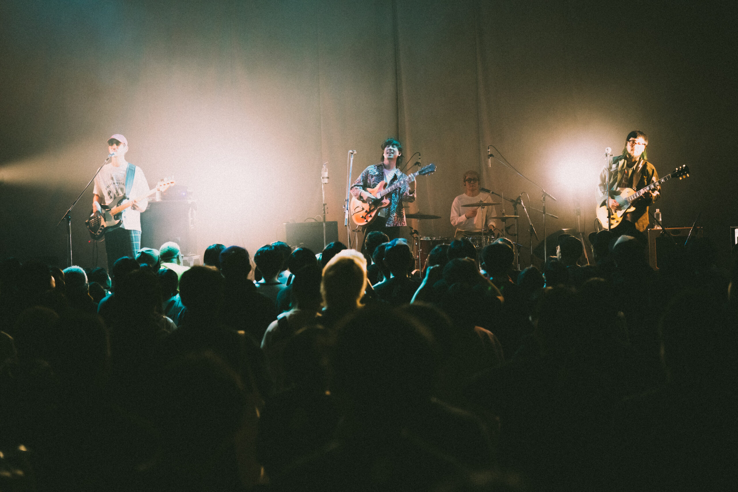 「今日も最幸な1日が始まるぞ…」という予感を肌で感じていると、岡本悠亮(Gt)のカッティングと土井徳人(Ba)・江山真司(Dr)が支えるリズムがダイレクトに胸に響く。初っ端から爆音で会場をぶち上げていく彼ら。そして、即座にゆるやかな曲に繋げる緩急はさすがであるし、どんな曲でも釜中健伍(Vo&Gt)の伸びやかで力強い声は今日も優しい。心地よいメロディの中で背中を押してくれる楽曲「Runnin’」では、会場が温かい空気に包まれ、皆思い思いに体を揺らす。