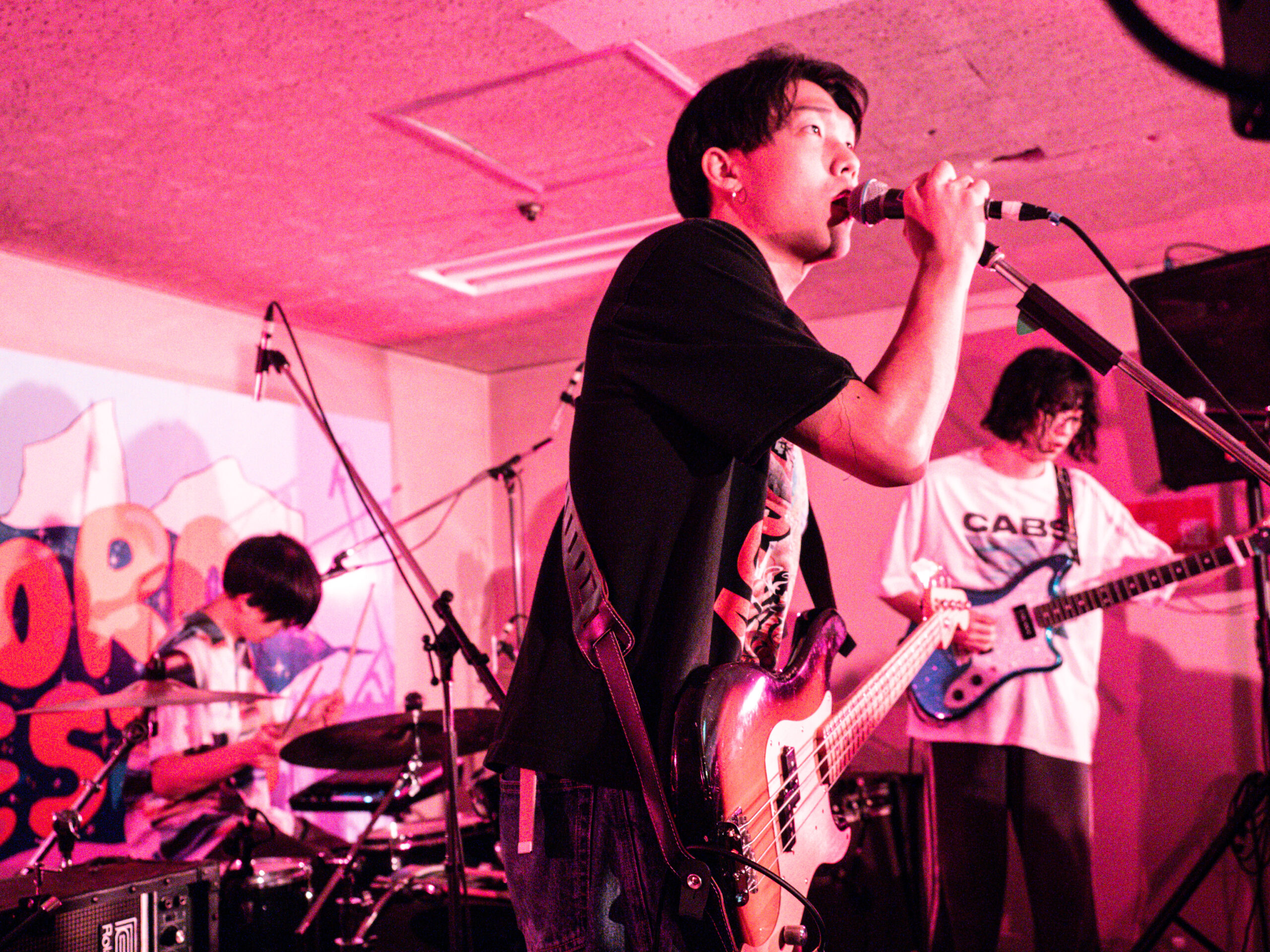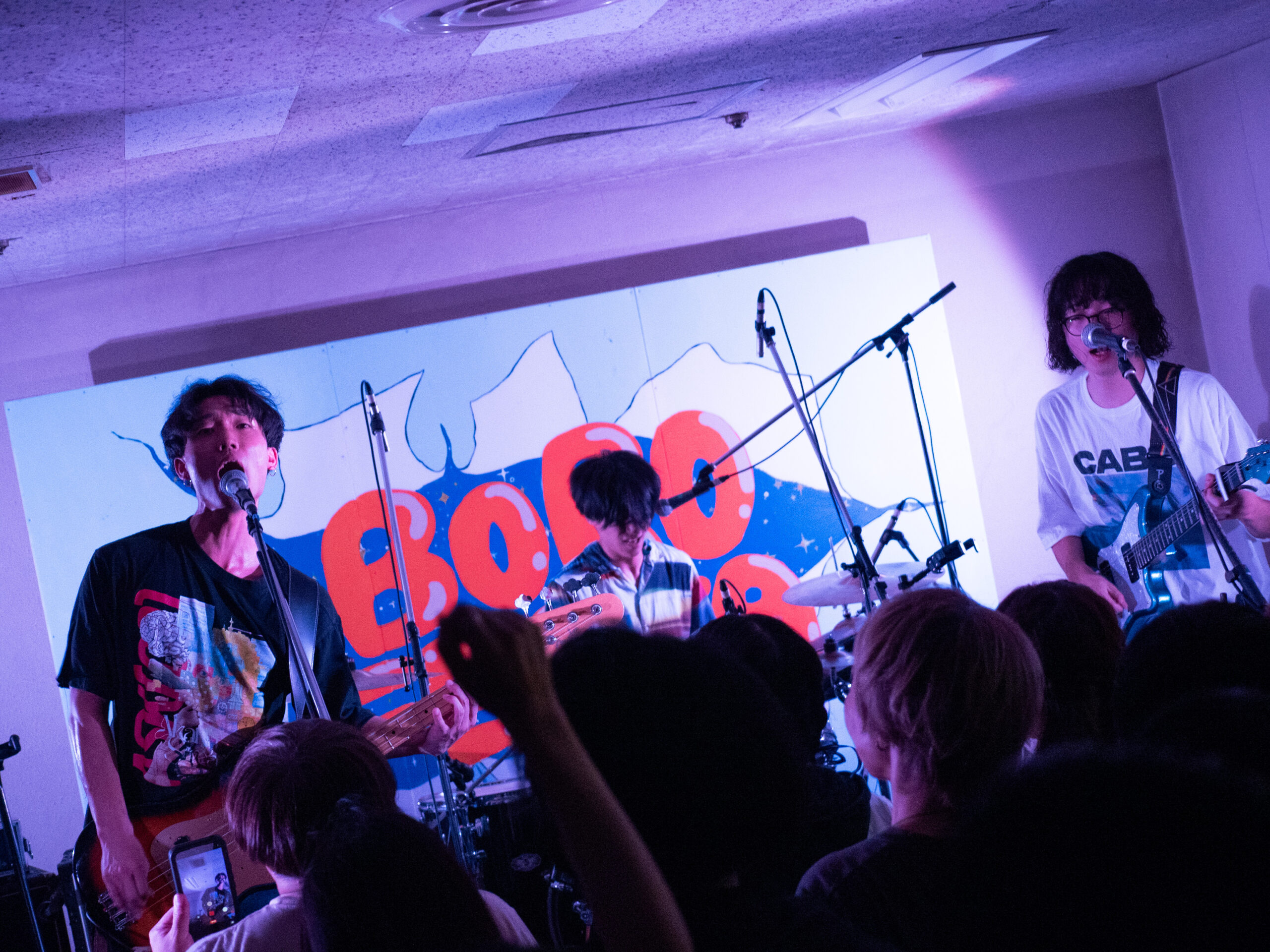 パーティー・ナビゲーター : MC土龍の頼もしい紹介からAkane Streaking Crowdが登場すると、ゴリゴリの存在感を放つ北里(Vo&Ba)のベースと、爽やかな表情で高出力の打音を刻む立本(Dr&Cho)のドラムが、華々しく街の底STAGEの開幕を飾る。