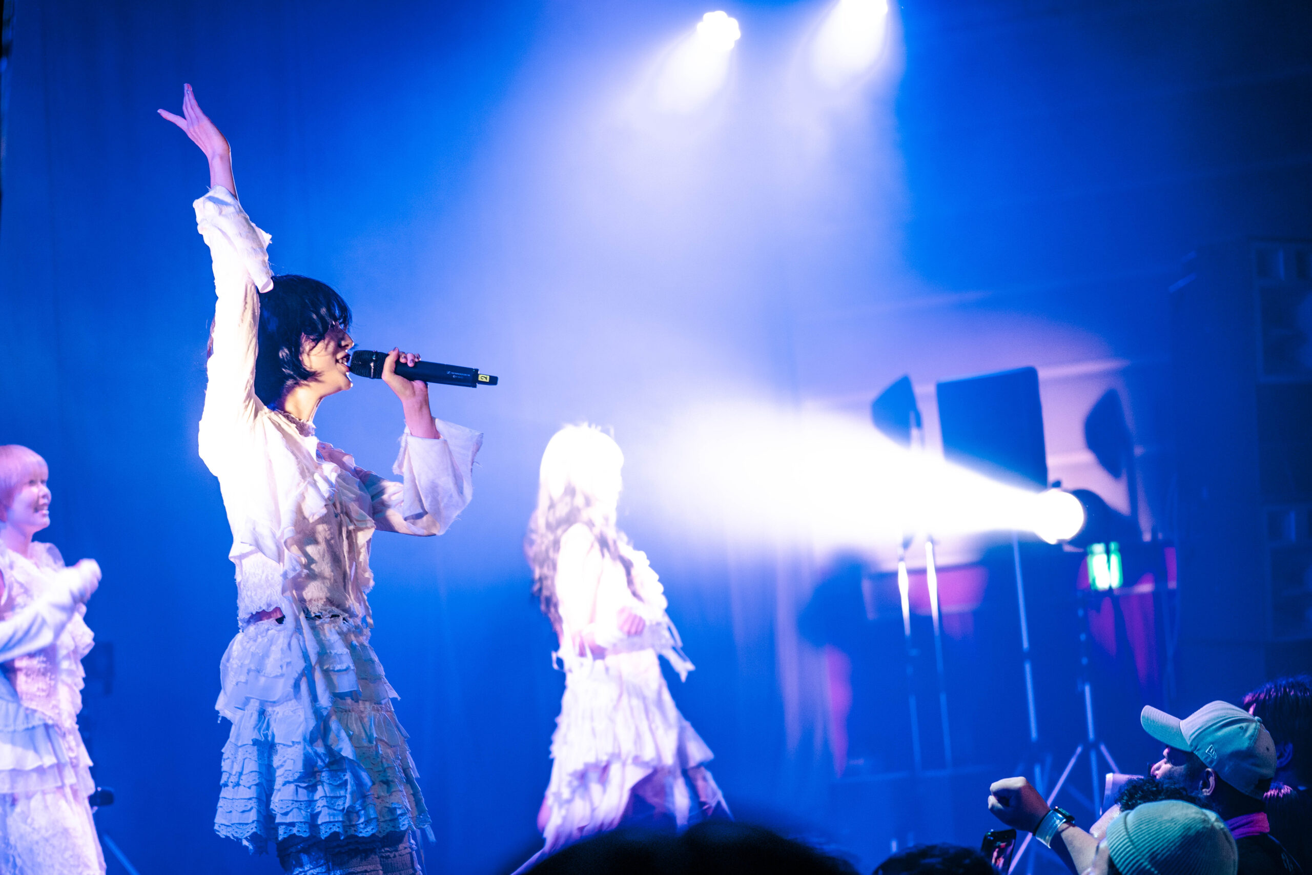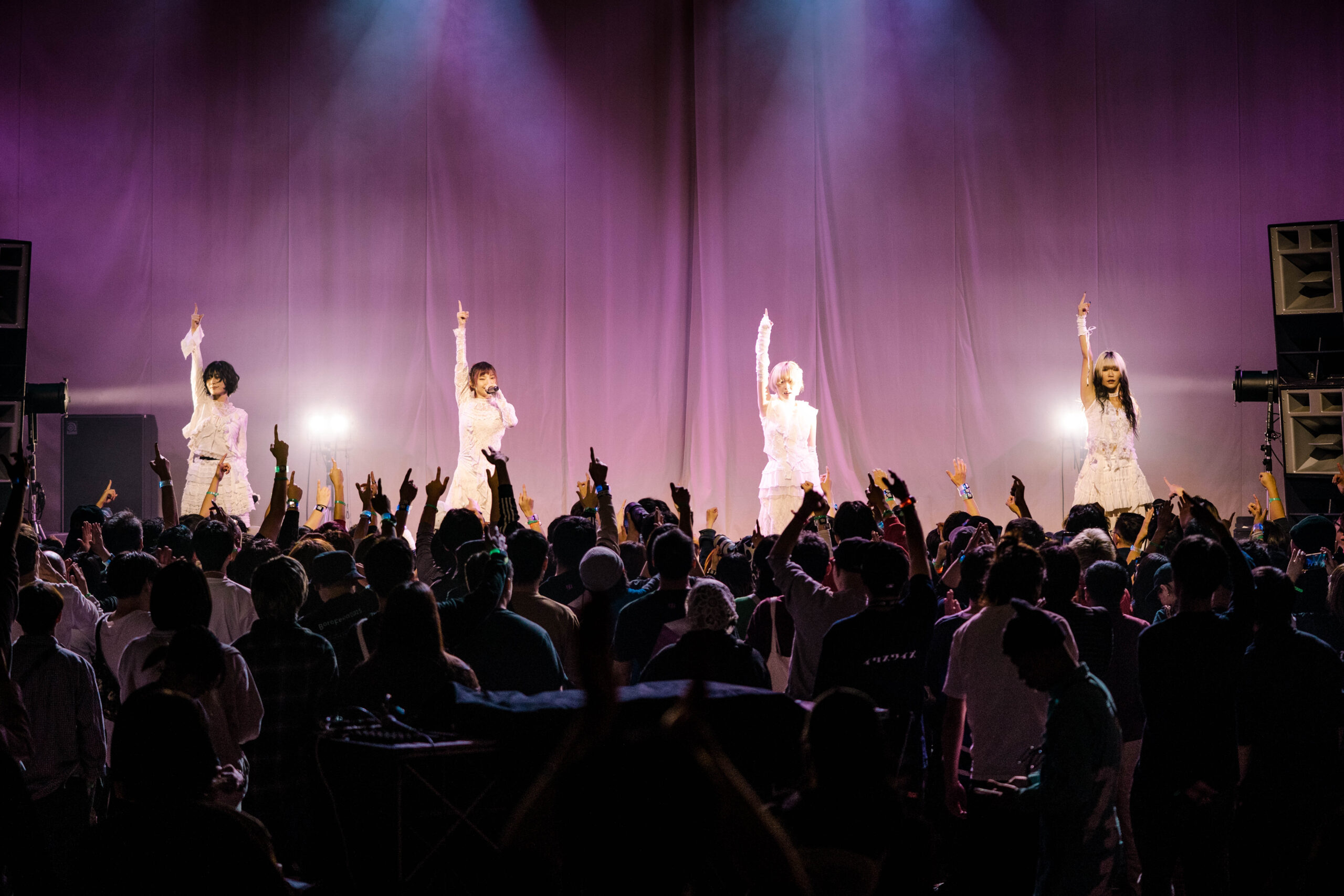 昨夜の熱狂をそのままに、ExWHYZが再びボロフェスタのステージに登場した。昨日とは違う純白の衣装に身を包み、1曲目からクラップで観客を煽る。観客も負けじと全力のコールアンドレスポンスで応え、序盤から昨夜を優に超えていく勢いだ。