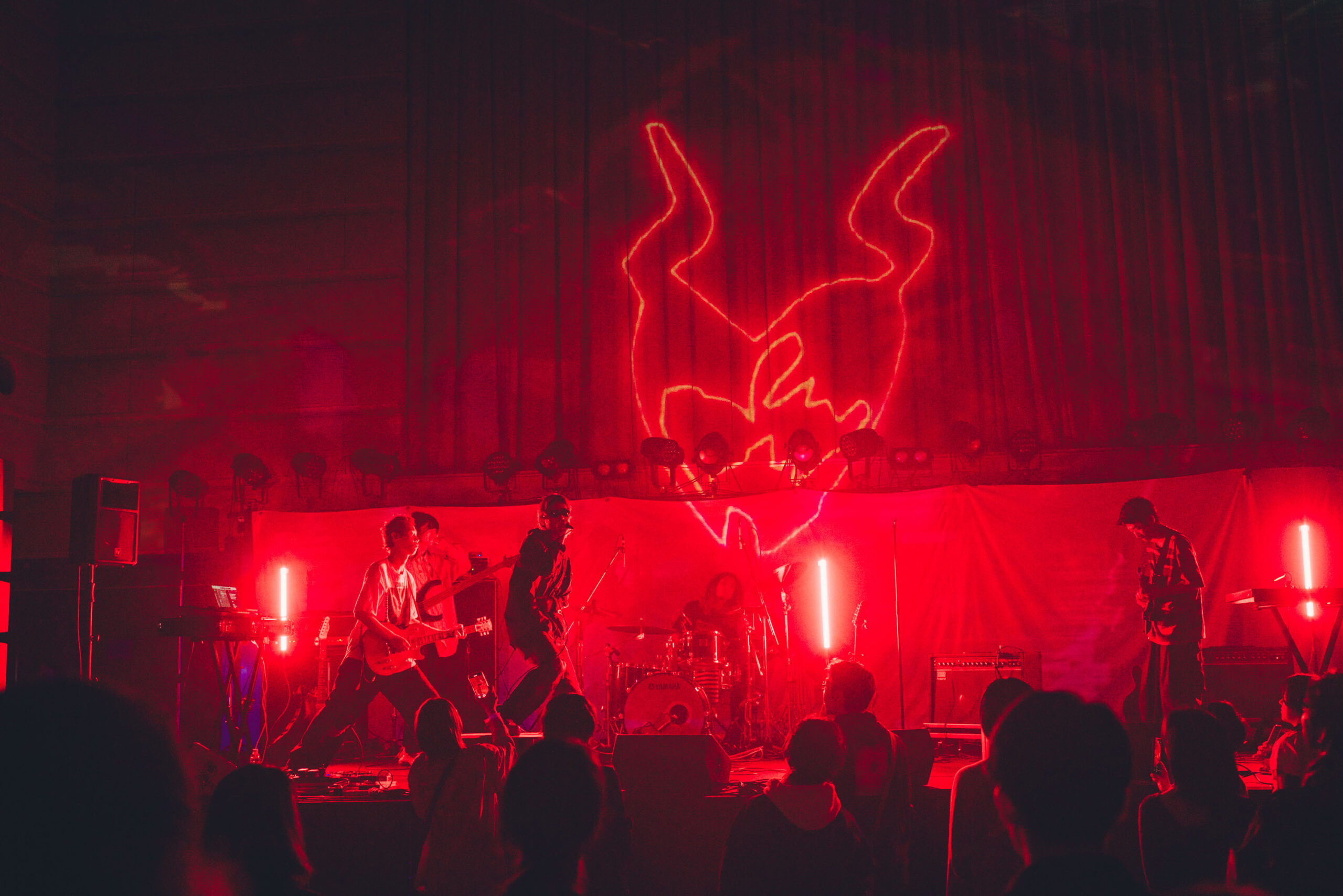 「Heart-Shaped Devil Ⅱ」で跳ね回り鼓舞するRyosei(Vo)が、4本の電飾とRyoma(VJ)による煌びやかな映像に照らされて輝いている。