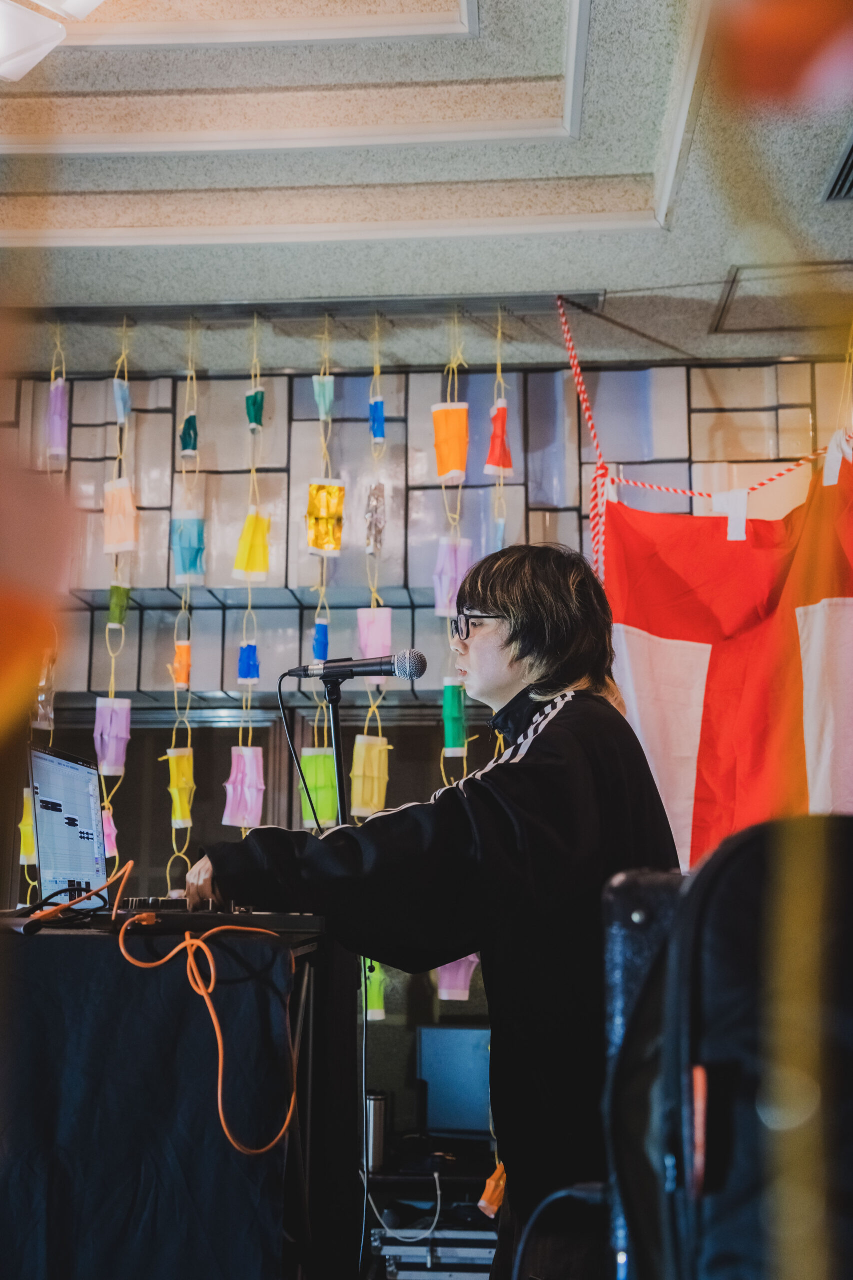 繊細で美しいエレクトロニカの音像、自然と身体を揺らすビート。そして力強くも優しい歌声が、ギター・プレイと共鳴しながら空間を満たしていく。フロアでは、その音楽に吸い寄せられるように、身体を預けて揺れる観客の姿があった。lilbesh ramkoとの共作曲「親愛なる君へ」では、「lilbesh ramko – i (dont) know.」の一節を引用する場面も。